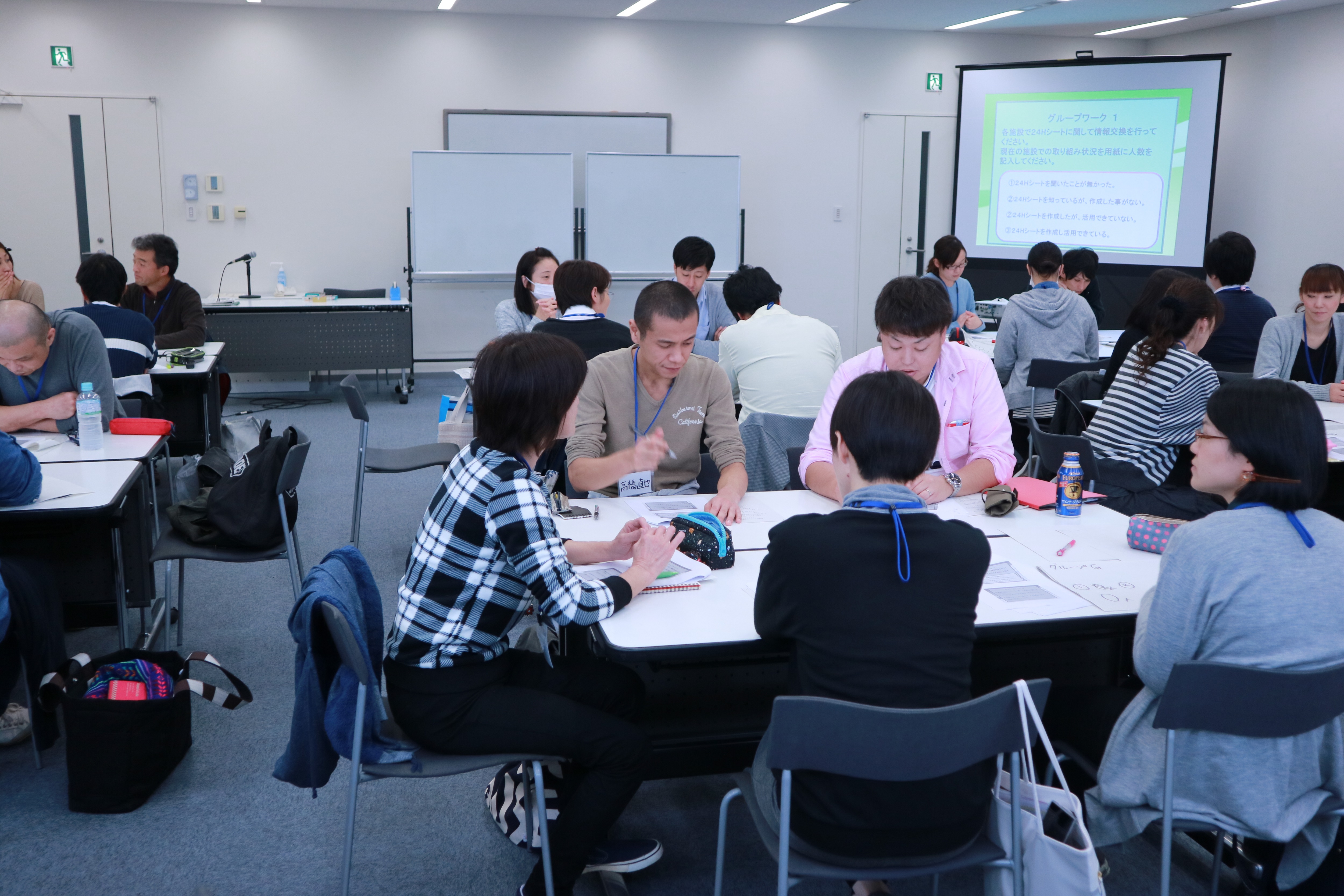 全体研修会は基礎講座としてユニットケアの理論とその実践について座学で学び、その後トークセッションの形式で研修を進めました。このセッションでは、ユニットリーダー研修の実地研修受入施設から、多くの失敗談を交えながら、ユニットケアの実践をお伝えいたしました。前段でお話しした「ユニットケアの理念と4つのポイント」についての講義内容についての理解を更に深める事ができました。今後ユニットケアを積極的に実践したいと考えている施設から「とても励みになった」との声をいただきました。また分科会では、ユニットケアを実践しているユニットリーダーの他に、一般の「介護職員・看護職員・機能訓練指導員・生活相談員・介護支援専門員」など、多職種の方々からの参加もあり、24Hシートを活用した実践についての関心の高さを伺うことができ、嬉しく思いました。