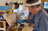 - 板前時代の腕は一生もの。材料の準備は職員がサポート。でも天ぷらを揚げる手つきは現役時代そのもの。