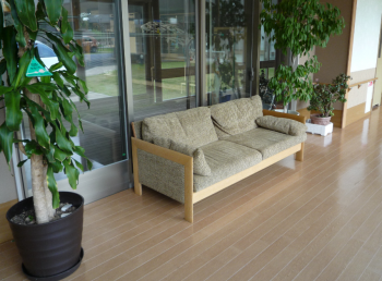 居室やセミプライベートスペースなど、施設のいたるところから、その豊かな自然を見ることができ、ユニットをつなぐ通りには、暖かな陽の光を感じながら、ゆったりできるベンチを設けられていました。この時期は、淡い桜の花や新緑、遠くにそびえる山の山頂の雪を眺めることができ、四季の移り変わりを感じることができました。