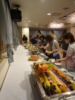 今回もたくさんの美味しそうなお料理を食べながら、実地研修施設の職員の方と受講者の方とお話が弾んでいる様子でした。