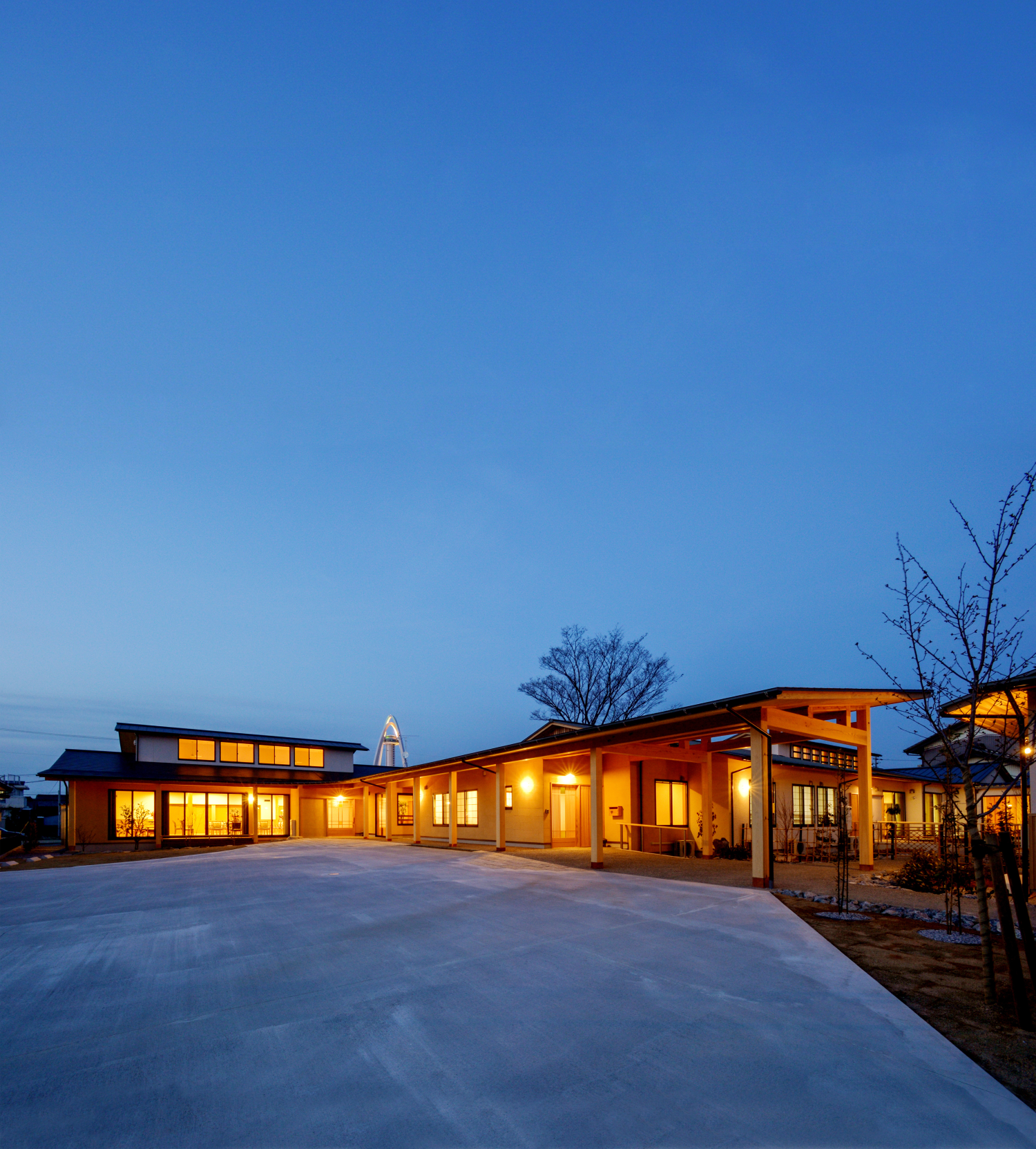 建物は木造平屋建て、3つのユニットが分棟になっておりそれぞれのユニットに玄関があります。各所に自然光や草木など自然を感じられる造りとなっています。